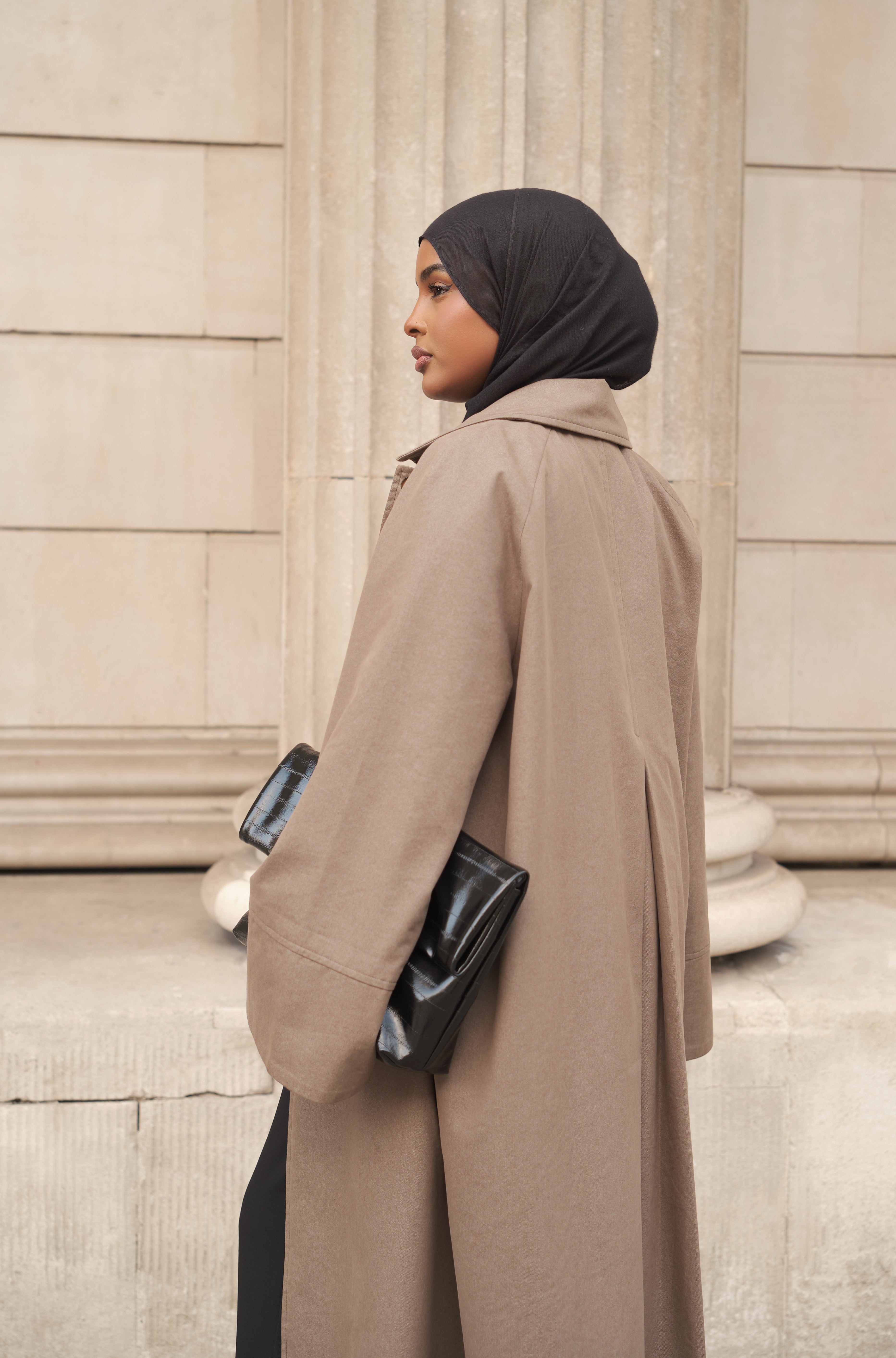 An oversized twill coat designed to sit over every layer in your wardrobe, from abayas to knitwear. Designed to drape beautifully and move with you, it’s the perfect blend of timeless tailoring and modern ease.